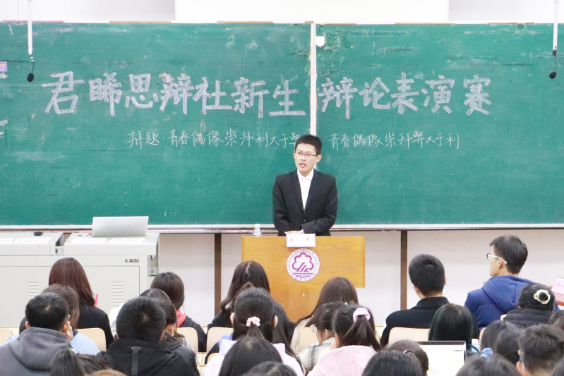 本次辩论表演赛的辩题为“青春偶像崇拜利大于弊还是弊大于利”。主席由君睎思辩社社长刘昕霏担任,计时由君睎思辩社办公室部长丛海越负责。在比赛开始前,刘昕霏介绍了比赛流程及规则并宣读本次辩论表演赛辩题。随后,双方辩友进行了自我介绍。