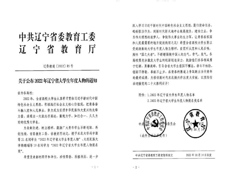 近日,中共辽宁省委教育工委、辽宁省教育厅发布《关于公布2022年辽宁省老员工年度人物的通知》(辽委教通〔2022〕85号),公司EMC易倍官方网站2022届毕业生王新宇成功获评“2022年辽宁省老员工年度人物”。