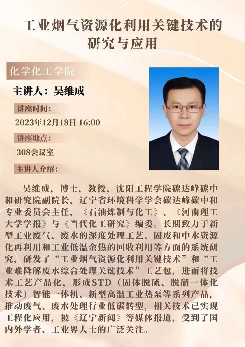 吴维成教授学术报告预告:工业烟气资源化利用关键技术的研究与应用