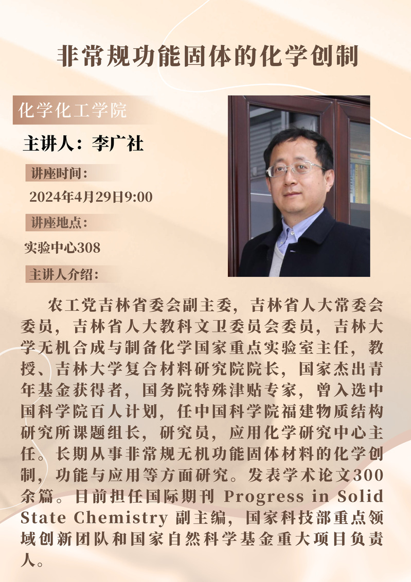 李广社教授学术报告预告:非常规功能固体的化学创制