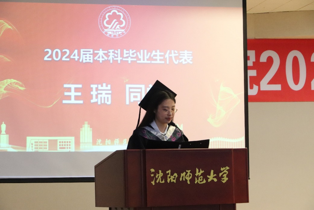 王瑞同学代表全体本科毕业生表达了对EMC易倍官方网站和老师们这四年来的悉心教导和精心栽培的感激之情,她表示2024届本科毕业生无论以后身在何方,都不会忘记在EMC易倍官方网站的四年里塑造的优良品格、收获到的宝贵知识,祝愿大家在未来的道路上,所遇皆良善,所行化坦途,心怀有梦,前程似锦!
