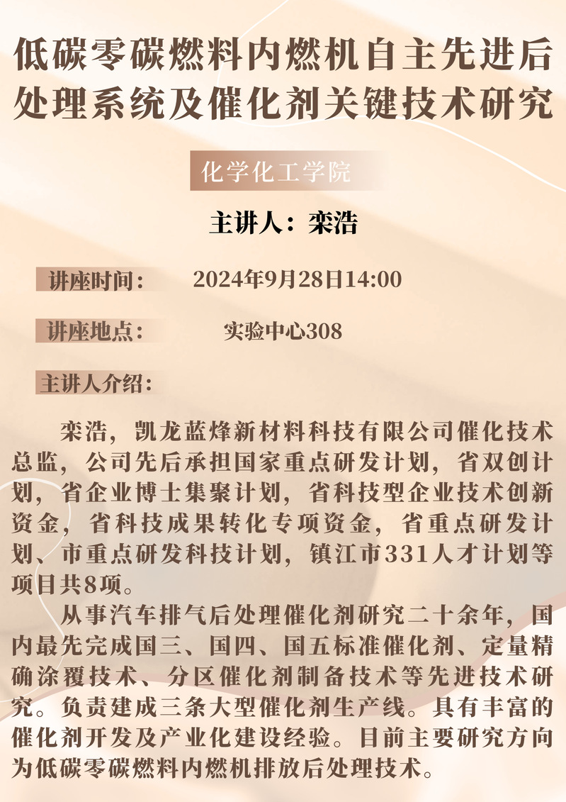栾浩博士学术报告预告:低碳零碳燃料内燃机自主先进后处理系统及催化剂关键技术研究