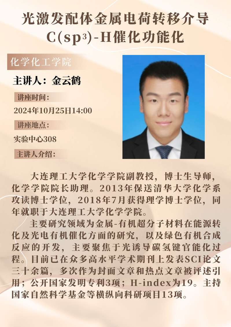 金云鹤副教授学术报告预告: 光激发配体金属电荷转移介导C(sp3)-H催化功能化