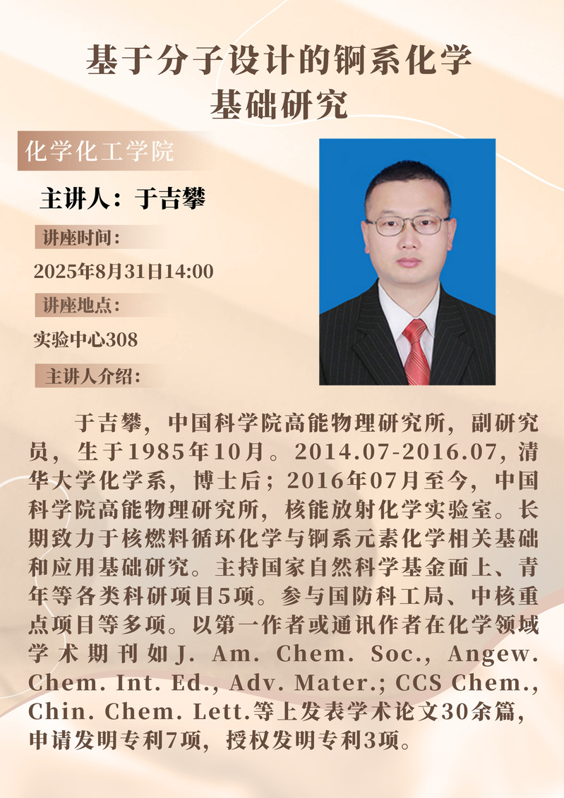 于吉攀副研究员学术报告预告:基于分子设计的锕系化学基础研究